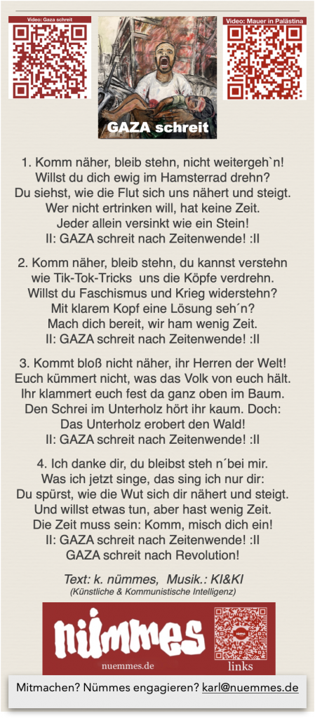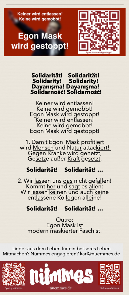 Zufällig zu einer Kundgebung vor Tesla in Grünheide gegen MassenMobbing wurde der neue Song von Nümmes und der KI&KI-Band veröffentlicht. Im Song erwähnte Personen sind frei erfunden. Ähnlichkeiten mit noch lebenden Personen sind rein zufällig bzw. systembedingt. Wer den Song live singen will, kann bei Nümmes ein Playback gegen eine kleine oder große Spende bestellen.